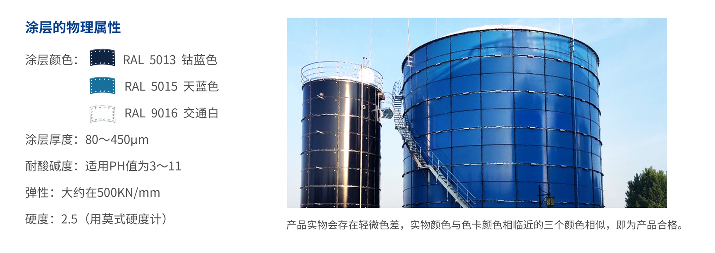 覆盖于钢板基材表面,经过热固化形成附着力强、耐腐蚀的涂层系统。钢板基材及安装方式同搪瓷拼装罐一致。
